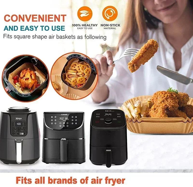 【Convenient to Use】: Disposable paper liners are pre-cut square bowl shape, and 50/125pcs packed in a dustproof transparent plastic box. Just take one and spread it with enough food on the air fryer basket. MAKE SURE NOT to use the liner while preheating.